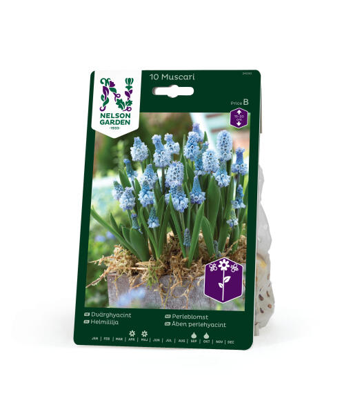 Denne letdyrkede og duftende perlehyacint vender gerne tilbage år efter år. De lyseblå blomster har en delikat, hvid kant og kan beundres tæt på. Ideel i urtepotter og bedets kanter og helt henrivende til borddækningsarrangementer.