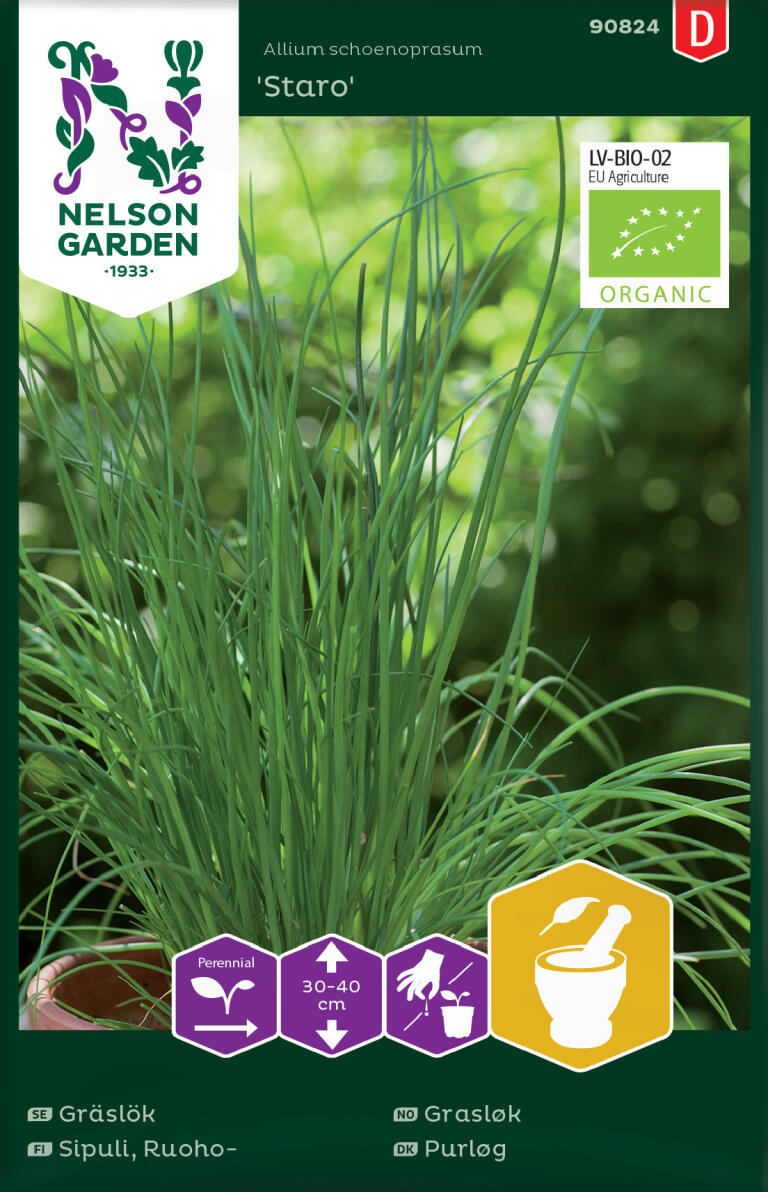 Økologiske frø. Denne sort giver smalle blade med skøn aroma og mild løgsmag. Blomstrer med lilla runde blomster. Høst bladene løbende og brug dem ferske i salat, kolde sovser eller som dekoration. Blomsterne kan også spises.