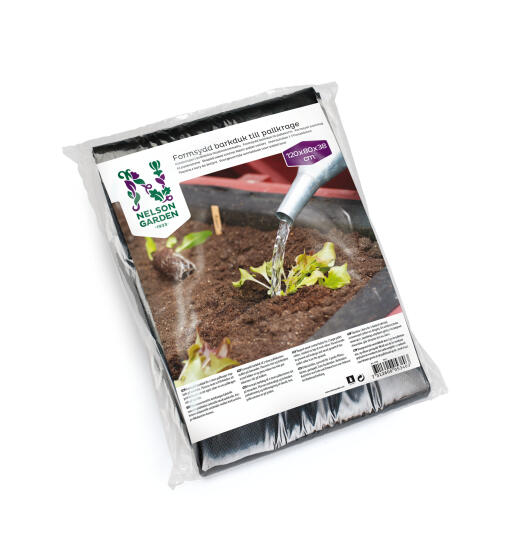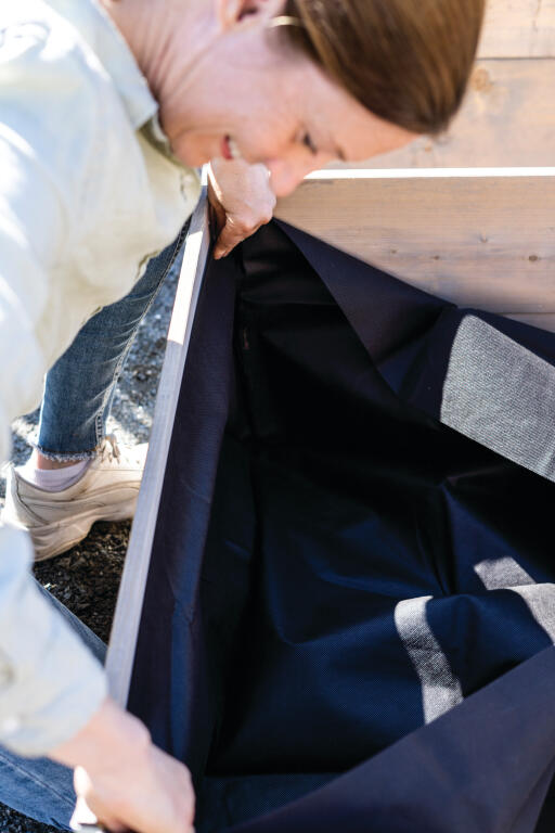 Placer dugen inde i pallerammerne og fyld den med jord. Dugen forhindrer jorden i at falde ud og forhindrer ukrudt i at vokse.