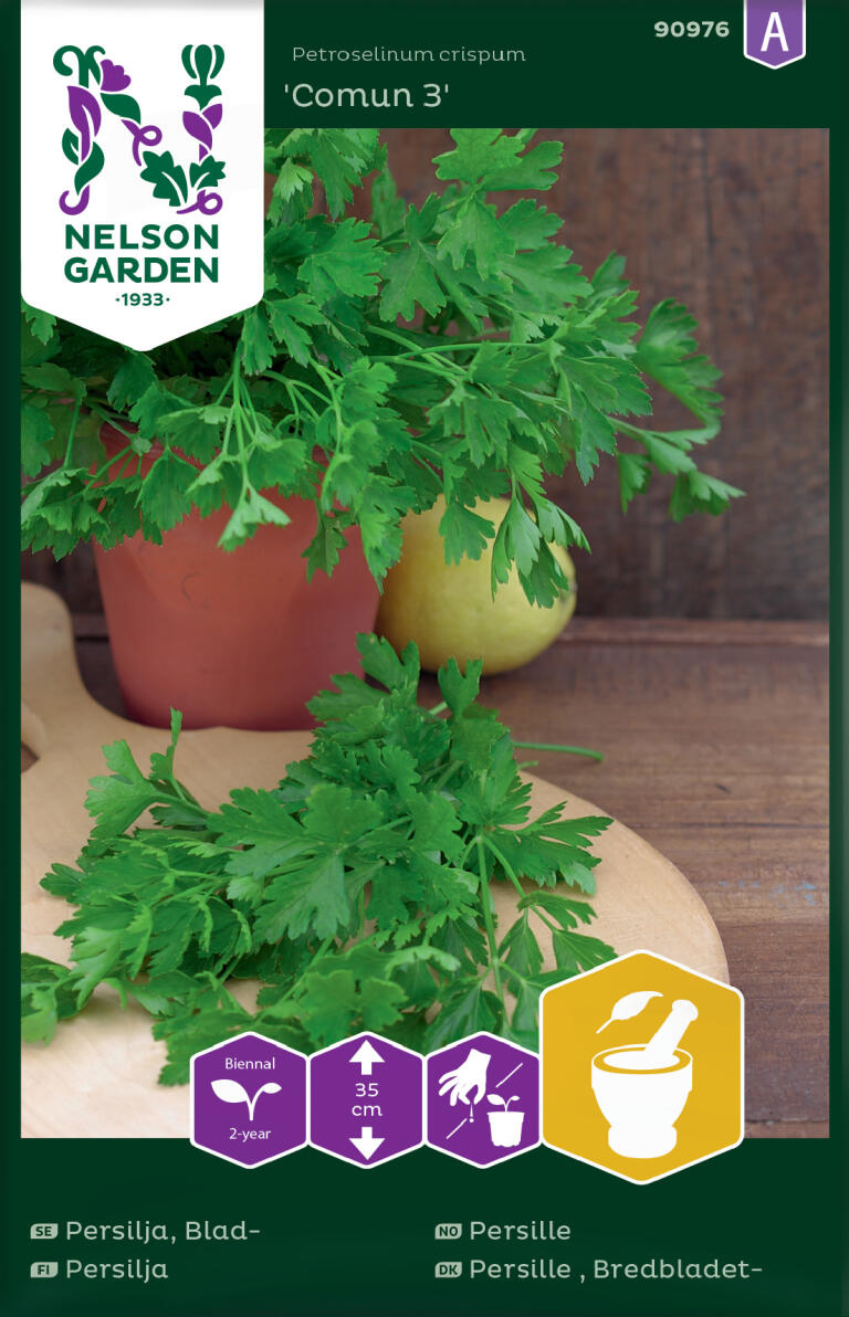 Bredbladet persille som er mere smagfuld end kruspersille. Spiringstid 2-4 uger. Høstes løbende, langt ud på efteråret. Kan fryses.