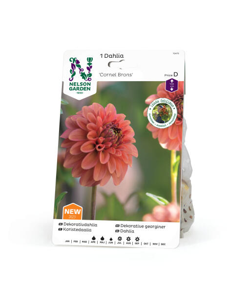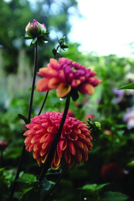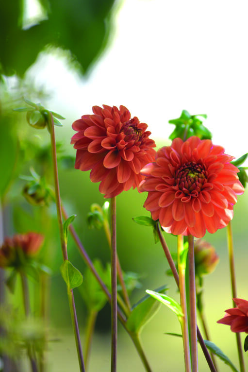 Høj abrikosfarvet pompomdahlia med mørke stængler, som er vidunderlig som snitblomst. En sommerglæde i bed og buket.