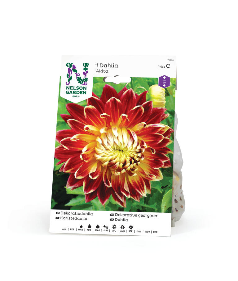 Statelig og høj dahlia med store, velfyldte blomster i cinnoberrødt, som skifter til orange mod centrum. Dekorative hvide spidser på kronbladene. Danner høje, omfangsrige planter, der fylder godt i bede og store krukker.