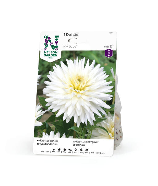 Ren hvid dahlia af kaktustypen med dens karakteristiske, store, strålende blomster, som altid vækker opmærksomhed og beundring. Plantes i bede eller potter. God til snit.