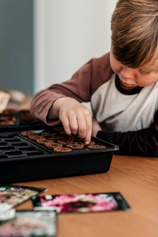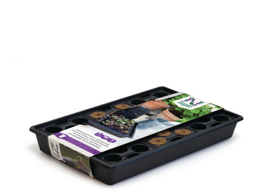 Dyrkningsbakke og miniplugsæt til jord eller briketter. Gør såning, forspiring og omplantning nemmere. Bunddel af genanvendt polypropen (PP), plugdel af polystyren (PS). 14 briketter af komposterbar kokosfiber, tørv og næring indgår. 23 x 37 cm