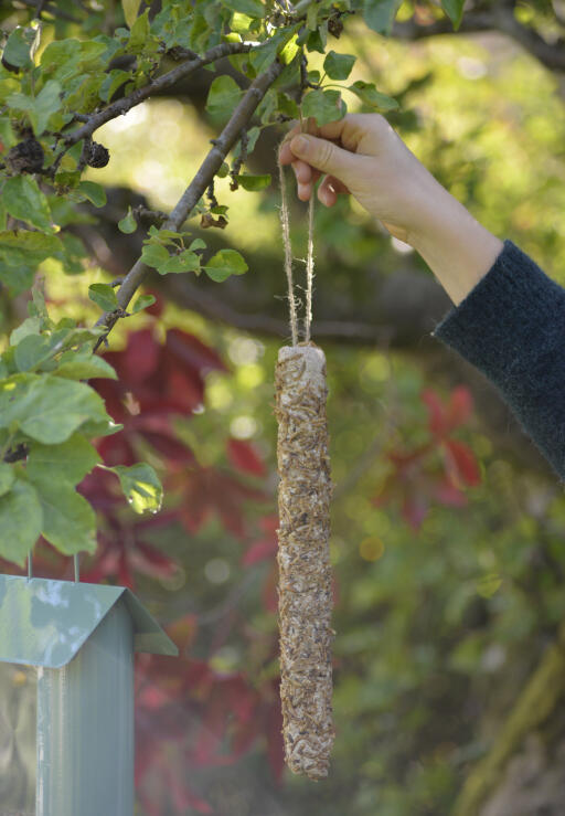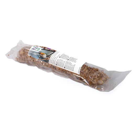 Energirig fedtstav med melorm, korn og frø. Fedt- og proteinrigt fuglefoder, som er bagt omkring en komposterbar pind. Klar til at hænge op i sin snor. Et 100 % naturprodukt. 400 g