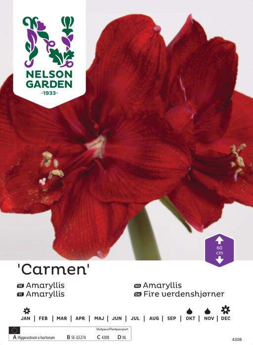 Mørkerød Amaryllis med navn som en smuk, glødende spansk kvinde. En julefavorit til jul med holdbare blomster. Velegnet og smuk som afskårne blomster. Dette ekstra store og kraftige løg blomstrer på mindst tre stilke, ofte fire.