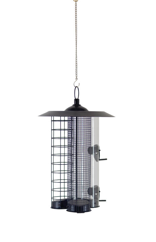 Fuglenes festbord. Stor foderautomat med tre beholdere, en til fuglefrø, en til nødder og en til mejsebolde (90 g). Hver beholder rummer ca. 1 liter (3 x 1 liter). Af plast og metal. H 34 cm Ø 24 cm.