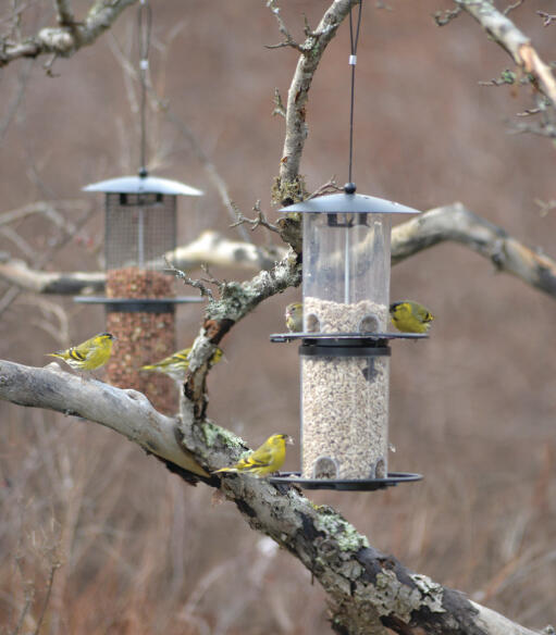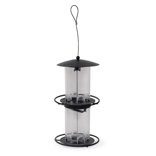 Traditionel foderautomat til fuglefrø med 8 foderåbninger og 2 sidderinge. Beholder i polystyren, øvrige dele af sort metal. Wire og karabinhage medfølger. H 35 cm Ø 18 cm.