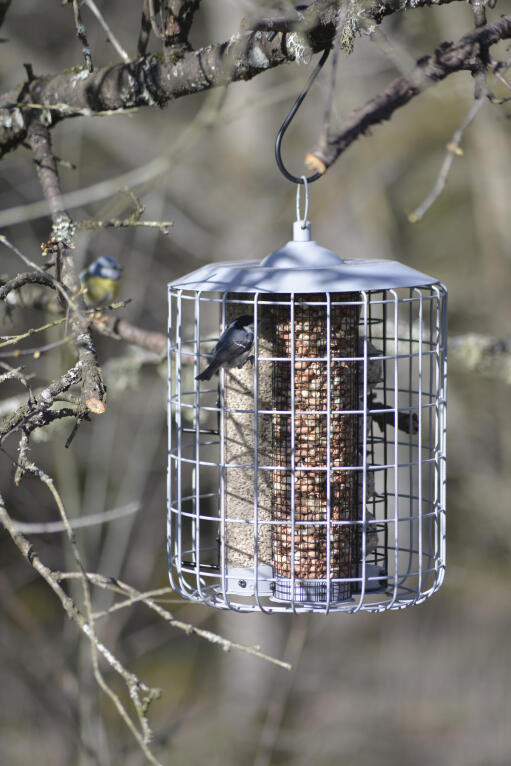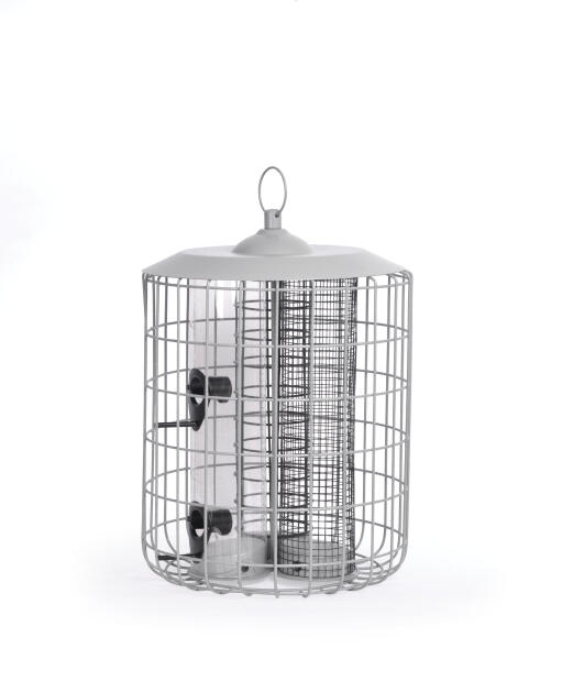 Stor foderautomat med beskyttende gitter, som udelukker større fugle. Tre beholdere, en til fuglefrø, en til nødder og en til mejsebolde (90 g). Hver beholder rummer ca. 1 liter (3 x 1 liter). Af plast og metal. Grå. H 34 cm Ø 24 cm