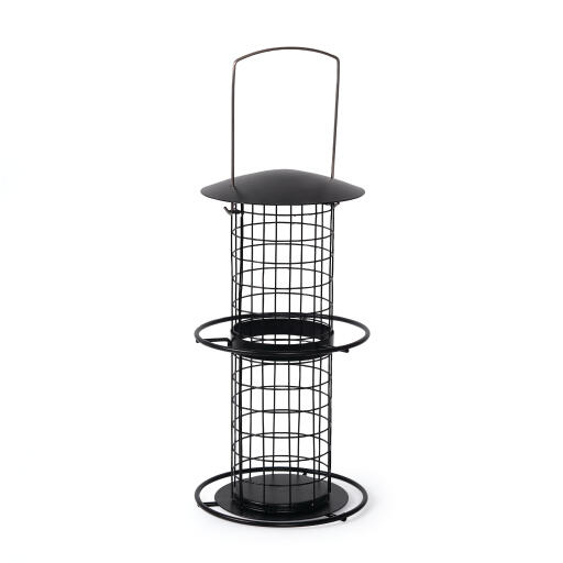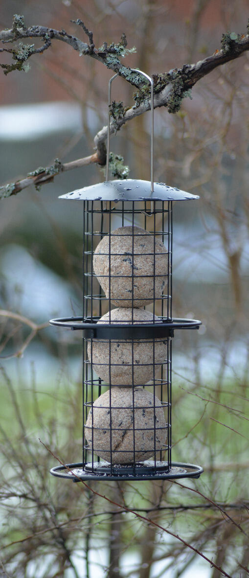 Traditionel foderautomat til både store og små mejsebolde (480 g og 90 g). Af sort metal og med 2 sidderinge. Bøjle til ophæng. H 35 cm Ø 18 cm