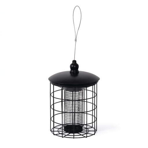 Foderautomat til nødder med beskyttende gitter, som udelukker større fugle. Påfyldes via fodermagasin i låget, som rummer meget fuglefoder. Med wire og karabinhage. Sort metal H 29 cm, Ø 20 cm