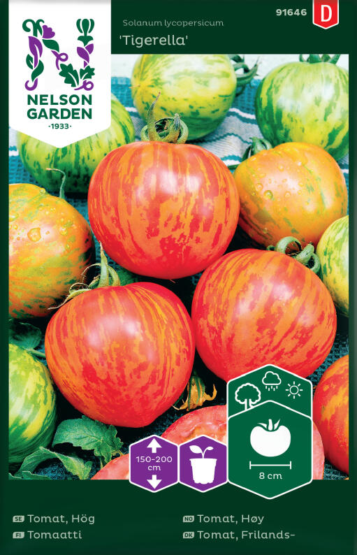 Sort, som giver en tidlig høst af røde tomater med gyldne striber. Plantes først ud, når nattemperaturen er over 8°C. Planten har brug for støtte og sideskud skal knibes væk.