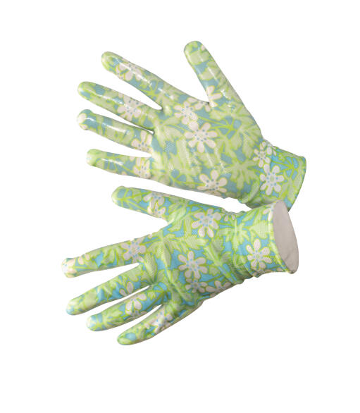 Fleksibel handske med en perfekt pasform og fremragende fingerspidsfornemmelse. Sømløs strikket polyester med gennemsigtig nitril dypning i retro mønster designet af Gunnel Ginsburg med et mønster af skovanemone.