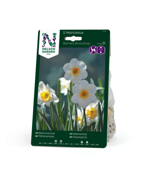 'Barrett Browning' er en havenarcis, der hører til gruppen Småtragtede. Blomsterne har hvide bægerblade og en tragt, som er lysegul. Anses for mindre appetitlig for rådyr, hare, kanin og mosegris.