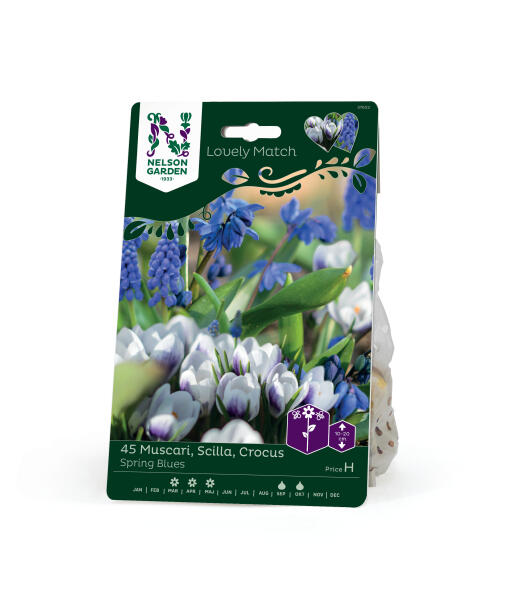 En stolt perlehyacint, en kruset skilla og en blødt afrundet krokus. Det bliver en rigtig sød forårsbuket i blåt og hvidt med indslag af violet. Velegnet til bedkant, kurv og potte, men også i den første lille vase om foråret.