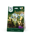Forårets første skønheder til bed og potte. Irisens lyseblå farve er næsten selvlysende og suppleres af porcelænshyacintens gennemsigtige blomster i samme nuance, medens det dristige gule mønster matches af krokussens bløde gule toner.