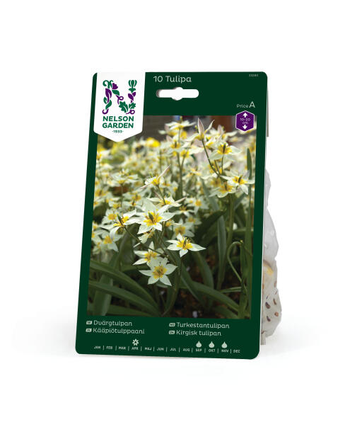 Kirgisisk tulipan blomstrer rigeligt og får ofte flere blomster på hver stængel. Blomsterne, der åbner sig til en hvid stjerne, er hvide på indersiden med gult centrum. Ydersiden af blomsterbladene er svagt gråviolette med gul basis.