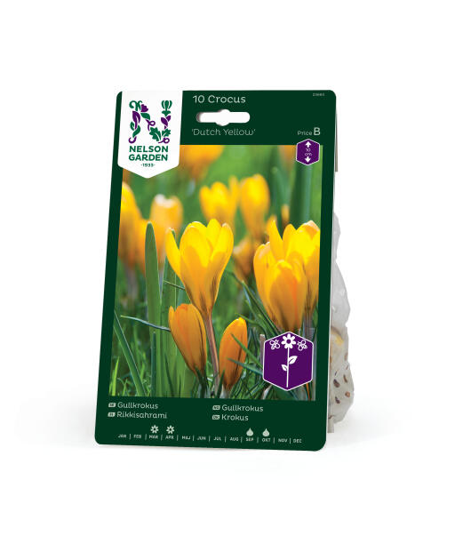 Krokussen 'Dutch Yellow' har relativt store, herligt smørblomstgule blomster med smalle, violette striber på de ydre blomsterblade. Foruden i bede passer den godt i kanten af buske og hække og foran træer, hvor forårssolen skinner.