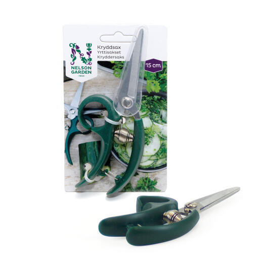 Lille og smidig krydderisaks. De lange skær gør det nemt at høste køkkenets krydderier og håndtagets hul til pegefingeren giver et godt greb. L 15 cm