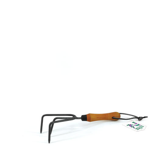 Håndkultivator af sort stål og med et smalt træhåndtag, som passer til de fleste hænder. Anvendes til bearbejdning af jorden. L 28 cm.
