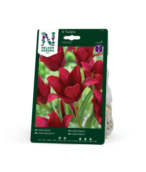Når solen rammer kronbladene, gnistrer denne elegante, liljeformede tulipan som et glas rødt Merlotvin. Den dristige farve fremhæves smukt af andre hvide og gule blomster, men bliver endnu dristigere sammen med orange eller limegrønne nuancer.
