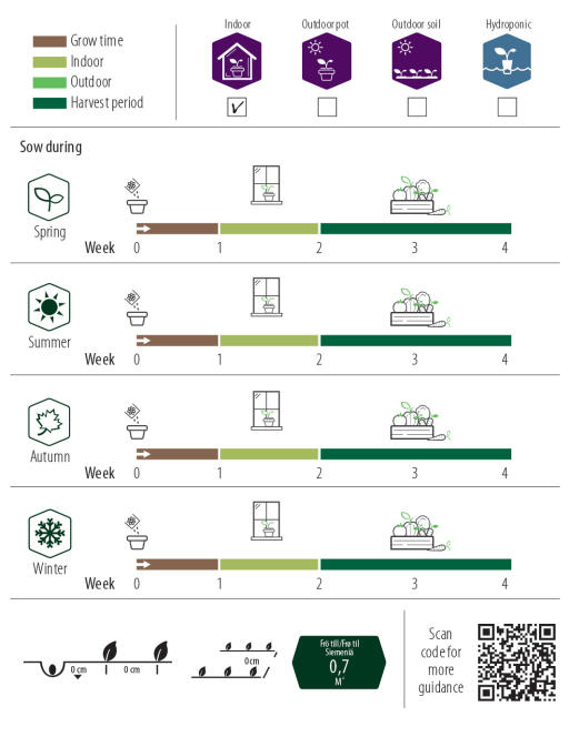Mere detaljeret information om, hvordan du sår, findes på produktsiden, som du kan nå via QR-koden på posen.