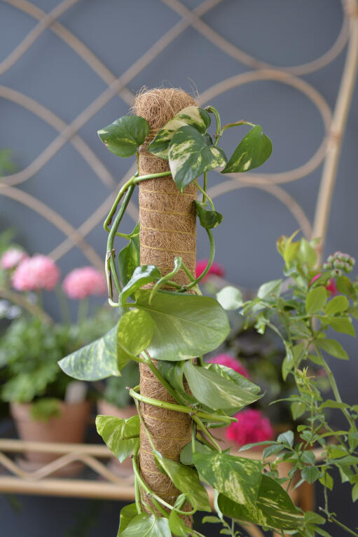 Plantestøtte fremstillet af naturmaterialer, træbeklædt med kokosfibre. Stilfuld og praktisk til indendørs slyngplanter som Vildvin og Klematis.