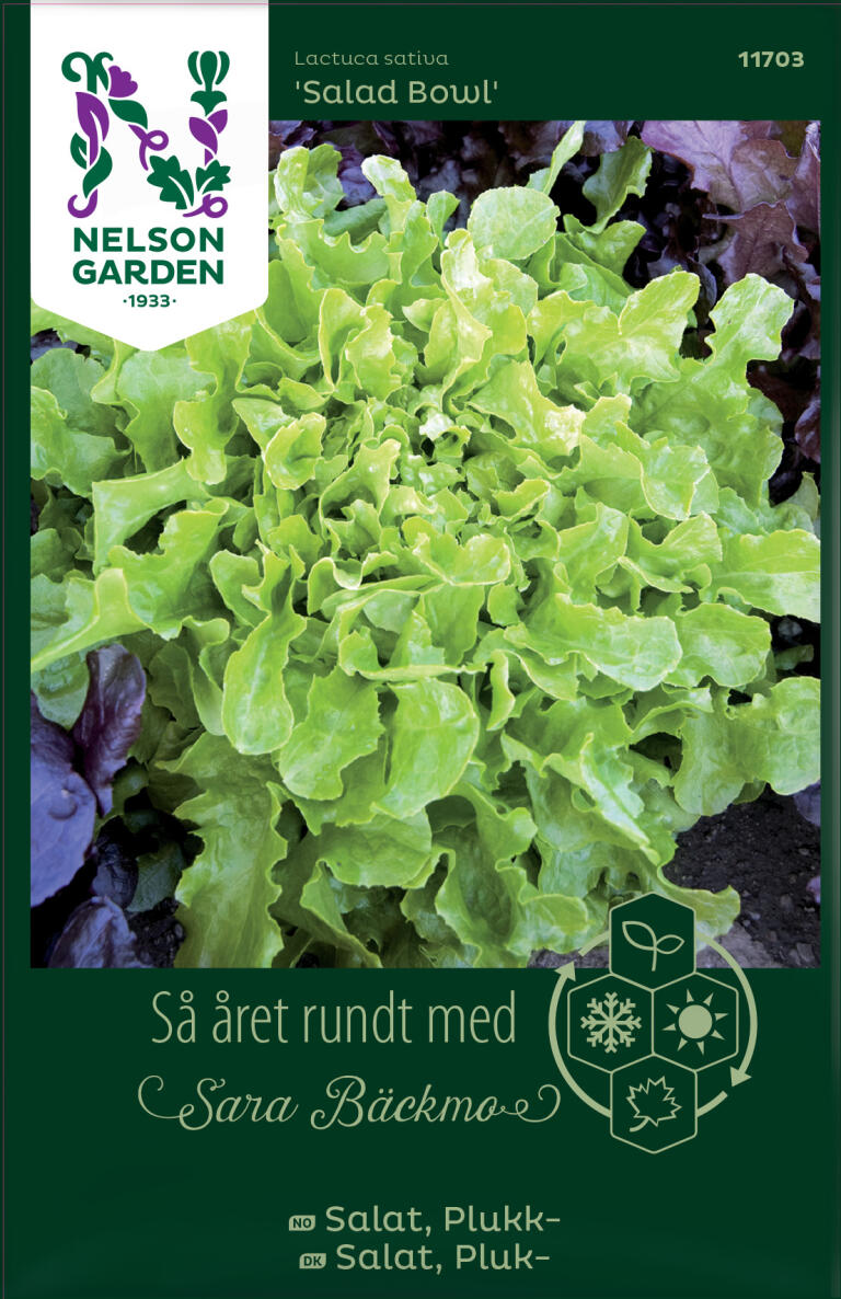 Lysegrøn pluksalat med egeløvslignende og krusede blade. Høstes løbende. Gentag gerne såningen hver anden uge.