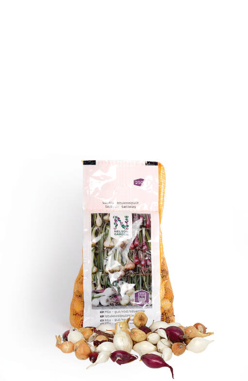 Sætteløg. Mix som indeholder gul løg, rødløg og sølvløg. En smagsrig og farvestrålende kombination af vores mest populære sorter. Varmebehandlet for en mere sikker høst.