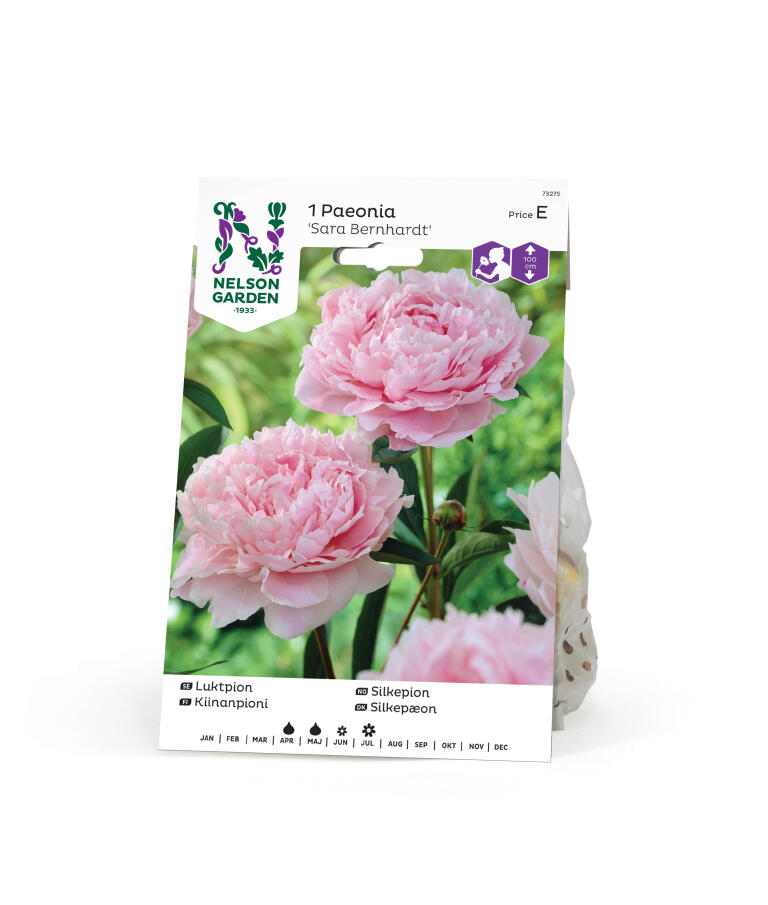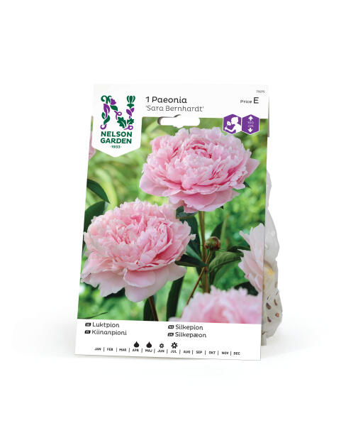 Klassisk haveplante af bedste sort, som bør findes i enhver have. 'Sarah Bernhardt' har store, tæt fyldte, rosa blomster og dufter herligt. Nem plante når den først er etableret. Kan kræve støtte.