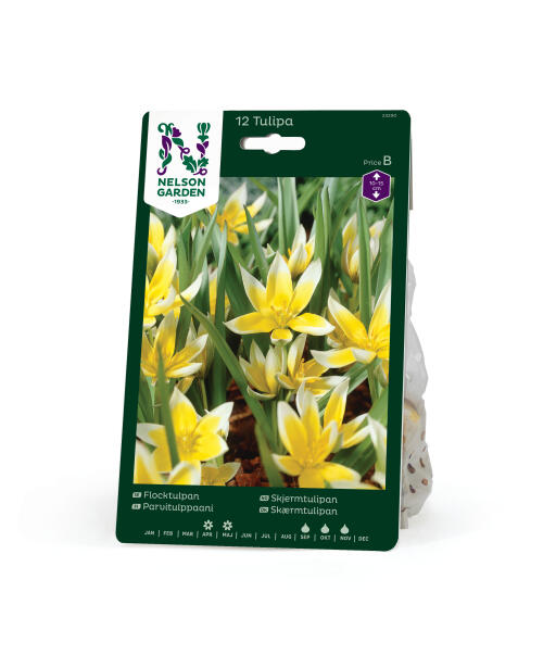 Skærmtulipanen blomstrer rigeligt og får flere blomster på hver stængel. Blomsterne, der kun springer ud i fuldt solskin, er cremehvide med et stort gult centrum og stråler som små stjerner. Ydersiden af blomsterbladene er ofte svagt rosabrune.