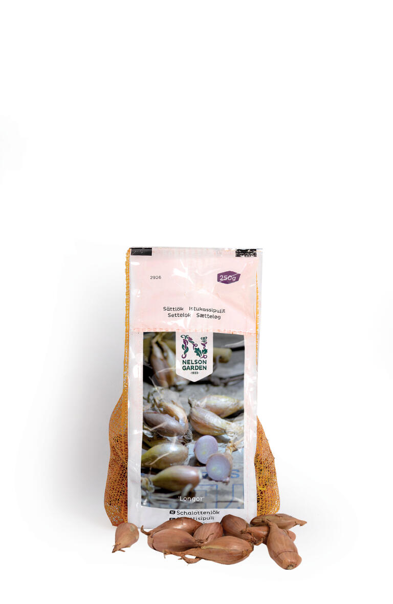 Sætteløg. Den aflange form gør dem ekstra nemme at skære. Aromatisk, og dejlig både grillet og rå. Skalotteløg vokser i knipper, og hvert sætteløg giver et nyt knippe løg. Kaldes også bananskalotteløg.