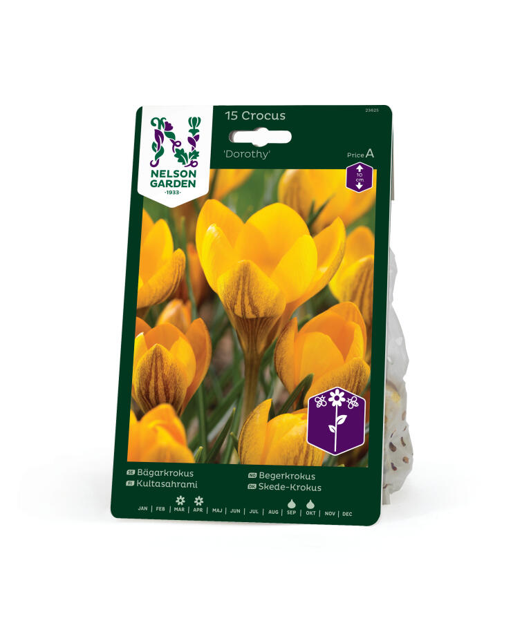 'Dorothy' er en køn lille duftende skede-krokus, som gerne kommer igen år efter år. Blomsterne er smukke gule med brune, mørke striber. Velegnet sort til tidlig blomstring i krukke.