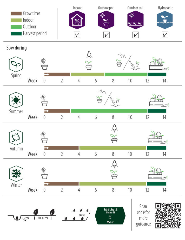 Sommer – Summer Forkultivér planter hele sommeren. Så sparsomt i såjord. Sæt 1 plante/potte i gødet jord, når planterne er store nok til at håndteres. Plant ud på friland eller sæt planten i en potte på terrassen.