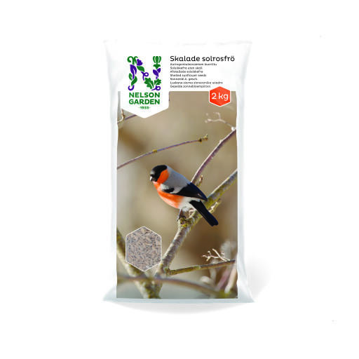 Afskallede solsikkefrø. Fuglene kan hurtigt få tilført energi fra de fede solsikkekerner, og der er ingen skaller, som ender som affald på altanen eller i haven.