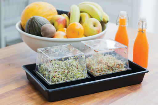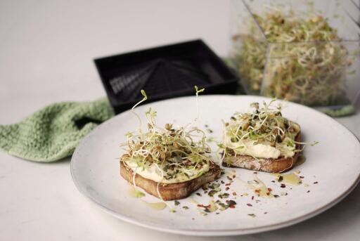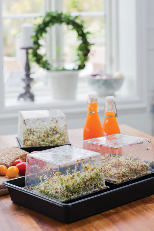 Ved hjælp af spireboksen er det nemt at dyrke spirer, f.eks. lucernespirer. 15 x 15 cm
