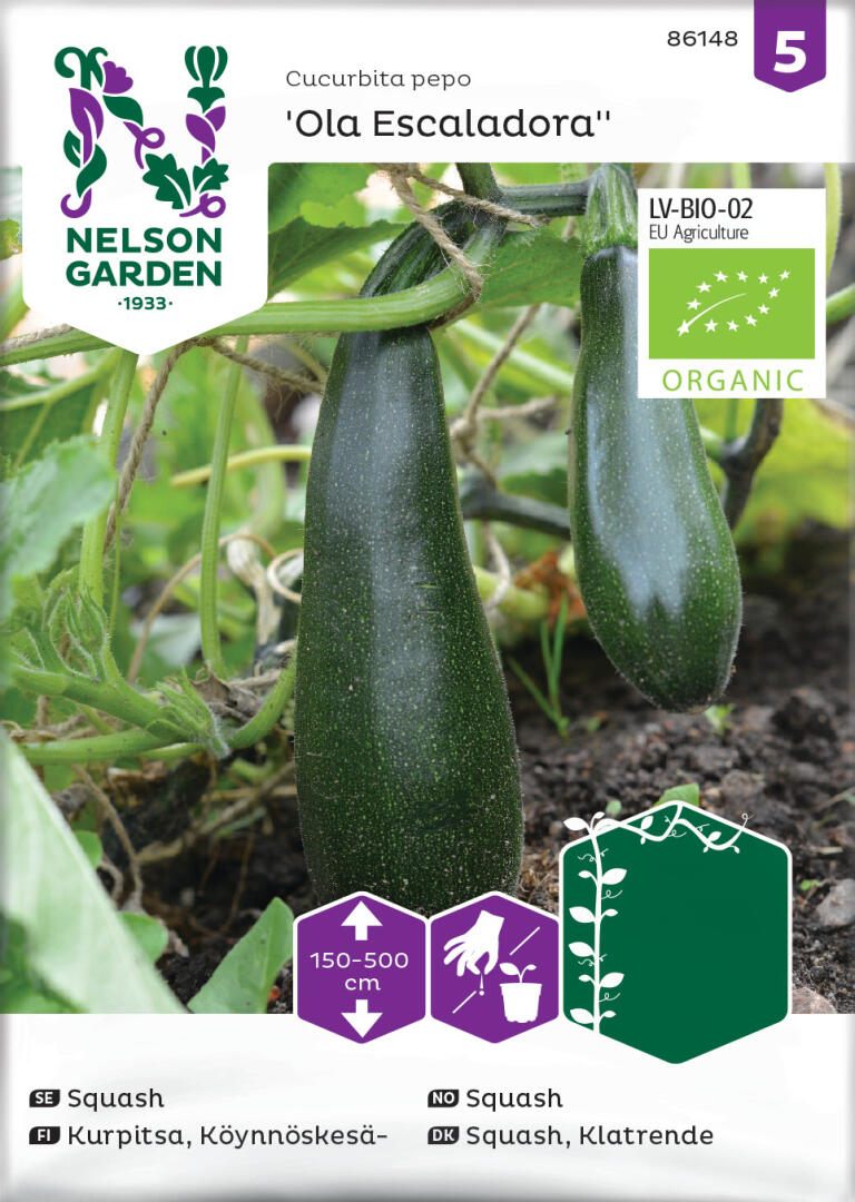 Økologiske frø. Klatrende squash som giver et rigt udbytte af grønne, ca. 20 cm lange frugter. Høst regelmæssigt. Planten skal have støtte. Top evt. sideskud.