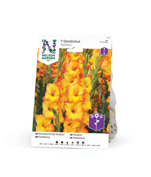 Vidunderlig gladiolus med en mangfoldighed af store blomster i en varmt gyldengul tone med orange kanter og midte. Et virkeligt blikfang i beddet, hvor den lyser op også en overskyet dag.