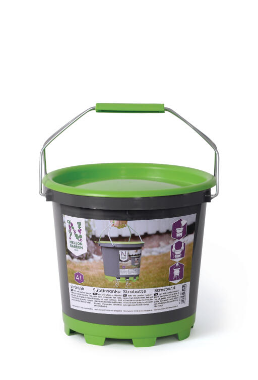 Fremskynd og gør havearbejde som f.eks. spredning af såsæd, havekalk, gødning eller salt - nemt. Denne smarte gødningsspreder har justerbare åbninger i bunden. Den er meget nem at anvende; du skal blot dreje spanden til den ønskede størrelse på åbningerne. Rummer op til 4 liter.