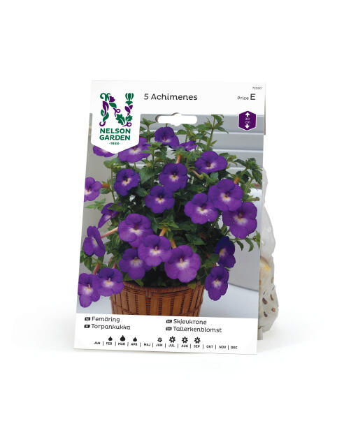 Vældig sød, gammeldags potteplante med blå blomster og frodigt løv.