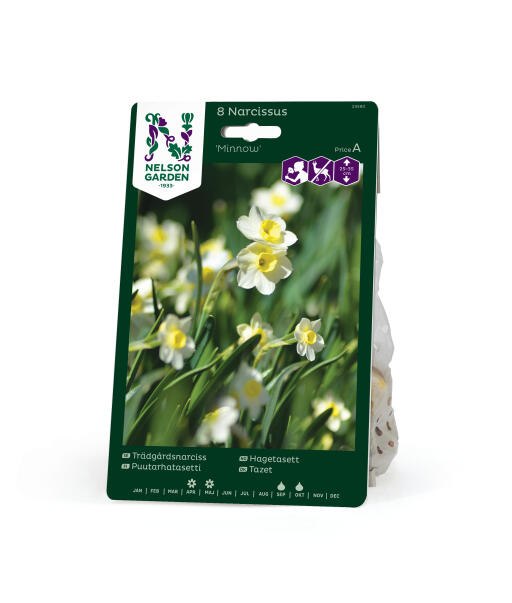'Minnow' er en tazet, som får to eller flere små duftende blomster på hver stængel. Bægerbladene er lysegule og tragten er mørkere gul. Sød både i bedet og i potter. Anses for mindre appetitlig for rådyr, hare, kanin og mosegris.