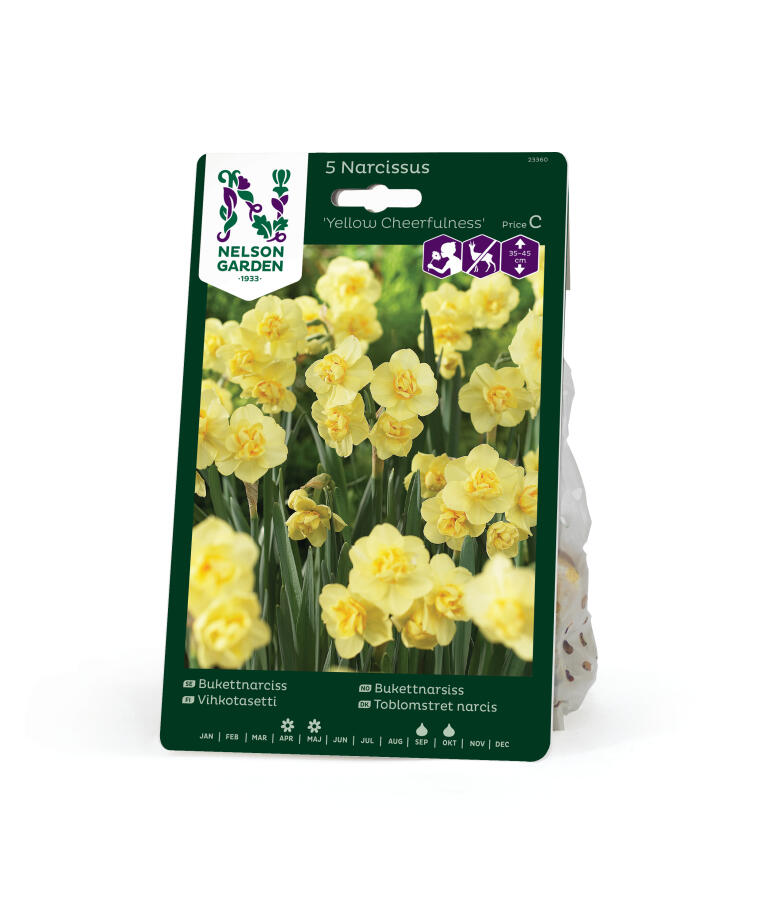 Dette er en toblomstret narcis, og som navnet siger, sidder der to eller flere blomster på hver stængel. Blomsterne er fyldte, lysegule med lidt gulorange og dufter godt. Anses for mindre appetitlig for rådyr, hare, kanin og mosegris.