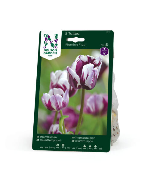 Ja, denne flotte triumftulipan kunne sagtens sammenlignes med et flammende flag som vajer i vinden i lilla og hvidt. Blomstrer længe og er lige så trofast i bedet som i den elegante forårsbuket.