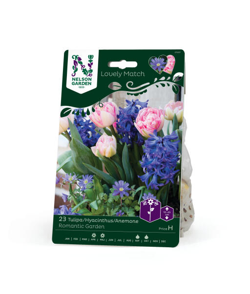 Med sit glade øje ser den søde balkananemone op mod den duftende hyacints stramme krone. To smukt matchende blålilla nuancer, der passer perfekt til den fyldte tulipans lyserøde toner. En dejlig buket til bedet eller en potte.