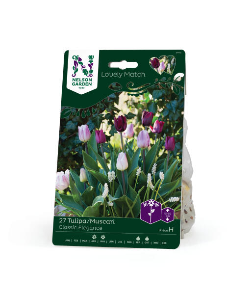 En afbalanceret farvekombination fra dæmpet vinrødt, over lillarosa toner til det hvideste hvide. Tulipanernes klassiske blomsterform fremhæves af perlehyacintens druer af kridhvide blomster. En stilfuld kombination til bedet og potten.
