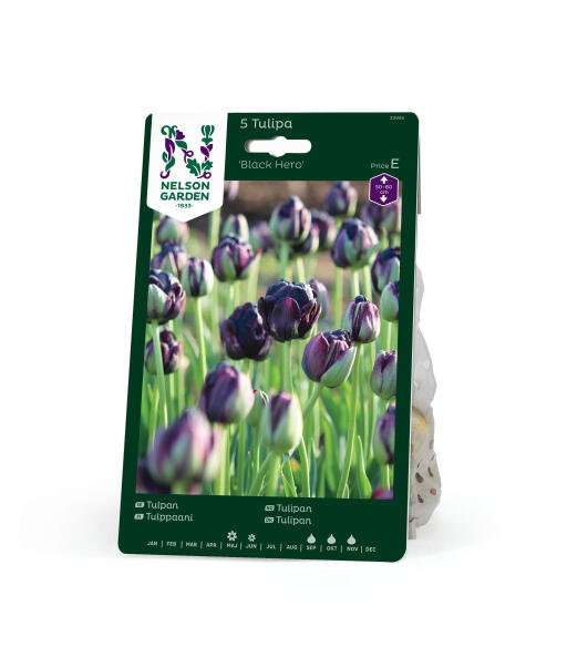 Statelig og dramatisk mørk, måske den mørkeste af alle tulipaner. De tætpakkede kronblade skifter fra silkeagtig mahogni til natsort, især i skygge. En smuk kavaler ikke mindst til tulipaner i orange og abrikos.