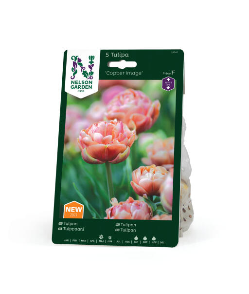 Imponerende, fyldt tulipan i en næsten skinnende kobberfarve. Den giver et stateligt indtryk i både blomsterbedet og potten.