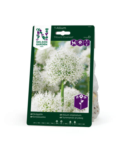 Pragtfuldt kæmpeløg med kuglerunde, cremehvide blomsterklaser, der svæver som snebolde i luften. Kuglerne, der består af små stjernelignende blomster, bliver ca. 15 cm i diameter. Anses for mindre appetitlig for rådyr, hare, kanin og mosegris.