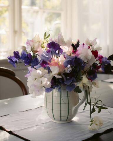 De første blomster kommer som regel midt på sommeren, og så er det bare om at finde saksen frem! Ærteblomster bør faktisk klippes ofte, for at planten skal producere flere blomster, og når vi klipper de blomster, som er sprunget ud, vil planten stimuleres til at producere nye knopper, som forlænger blomstringstiden betydeligt. Der er jo næsten ikke noget bedre end at begrave ansigtet i en luftig buket med ærteblomster, og med en håndfuld planter kan du fylde vaserne store dele af sommeren.