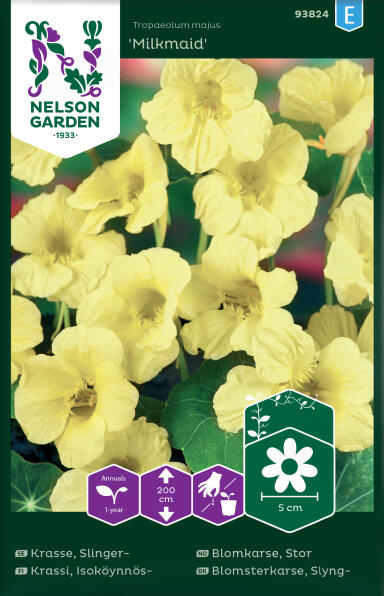 Frø til slyngblomsterkarse fås også i flere herlige blandingsposer. 'Out of Africa' blomstrer i gule, orange og røde nuancer og er ekstra pragtfuld med grønhvide blade.